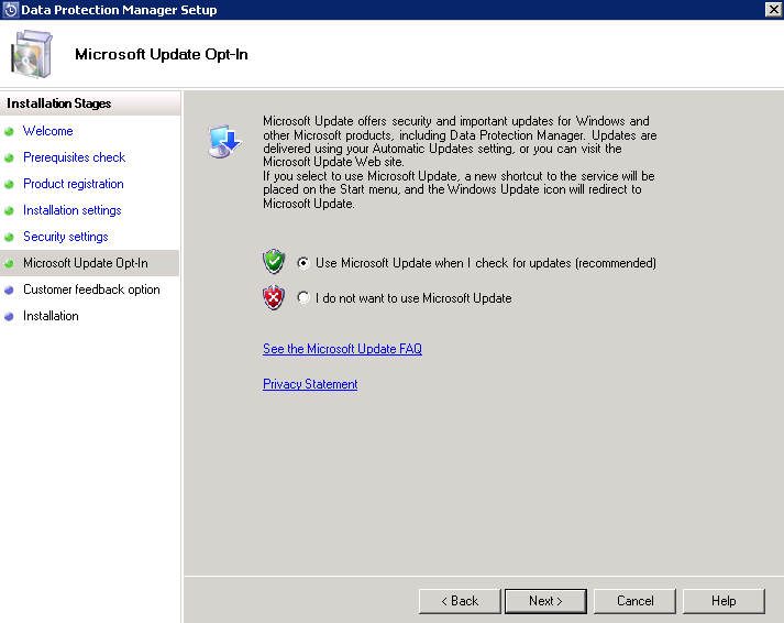 Selecione se você quer ou não participar do Microsoft Update e clique em ‘Next’.
