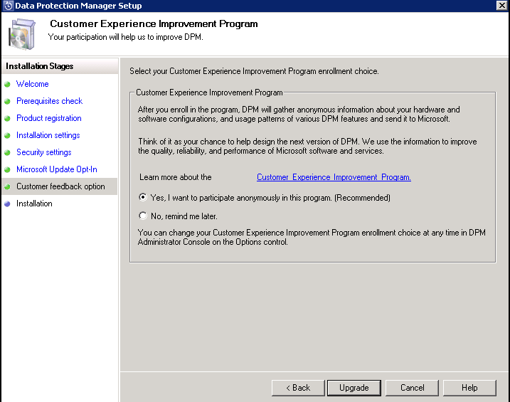 Escolha se você vai ou não participar do CEIP e clique em ‘Upgrade’ para iniciar o upgrade da instalação.
