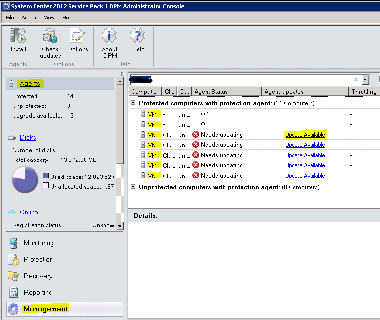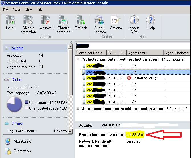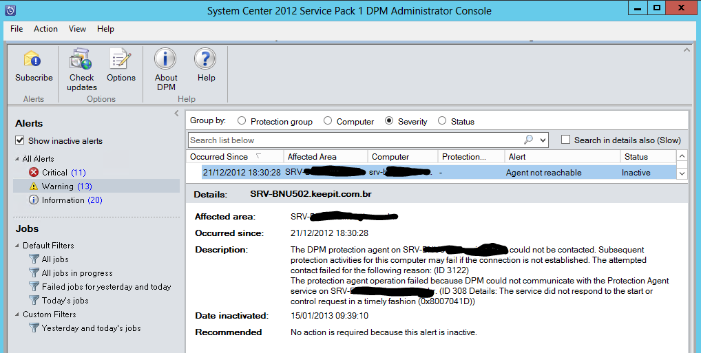 Bom, para encurtar a história, tive problema em algumas máquinas ao fazer o upgrade do agente do SCDPM 2012 para o SP1, recebi na console alertas que até o agente do servidor de DPM estava com o agente ‘Unavailable’.