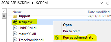 Para iniciar o upgrade do SP1, parece que você está iniciando uma nova instalação do produto, na mídia de instalação, clique em ‘Run as administrator’ no DVDDrive:\SCDPM\Setup.exe.