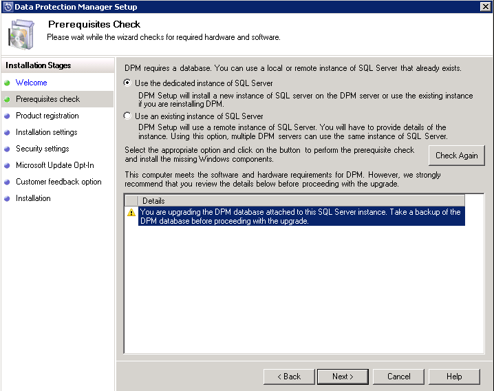 Se você for fazer o upgrade de uma instancia local do SQL, na tela de ‘Prerequisites Check’ selecione ‘Use the dedicated instance of SQL Server’ e clique em ’Check and Install’.